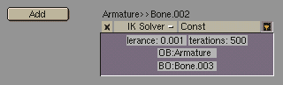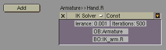 Time to add constraints. Enter pose mode (Figure 24) and open the "Constraints" menu. Choose "Hand.R" and add an IK solver constraint. In the "OB" field type the object name: Armature. The bone went to the center of the armature, but we'll fix this now. In the new "BO" field, that appeared in the constraint window, type the bone name "IK_arm.R". This will be the IK solver bone controlling the arm motion (Figure 25).