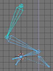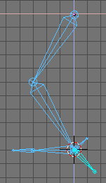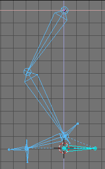 Test this - now it works. When you move the upper leg the foot stands still (Figure 36). That's good. But still not enough. Move the upper leg up a bit more. The leg chain goes up, but the foot stays on the ground. Well, that's a shortcoming of this setup, but you're not supposed the raise the body so much and not move the IK solver up too during animation...