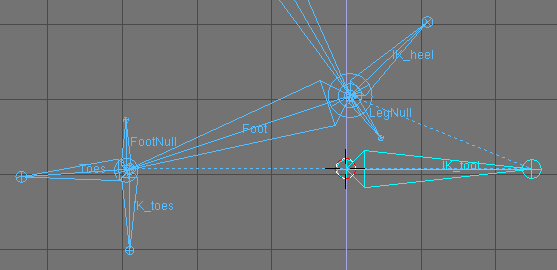 To "FootNull" - an IK solver constraint (target - "IK_toes")