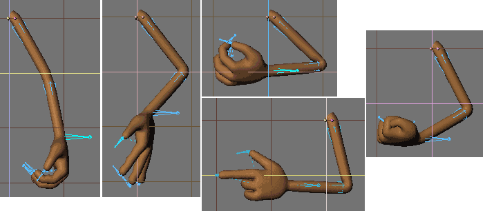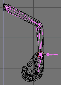 When you're finished adding vertices to vertex groups, exit edit mode and parent the arm to the armature. If you haven't made any mistakes now you'll have a well set up arm with a hand. Select the armature, enter pose mode, select the different IK solvers and test the arm and fingers (Figure 29).