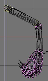 Now let's do the tricky part: Select the vertex group "ArmHi.R" from the edit buttons by clicking on the small button with the white minus sign. Now look at the 3D window. Select all the vertices that you want to be deformed by the "ArmHi.R" bone. (Figure 27).