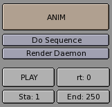 The ANIM button starts the rendering. The first and last frames of the animation are given by the two NumButtons at the foot (Sta: and End:), and by default are 1 and 250.