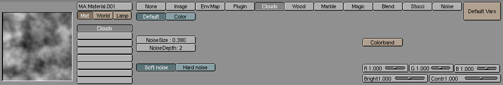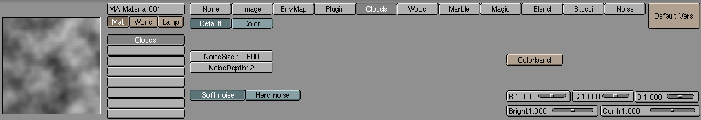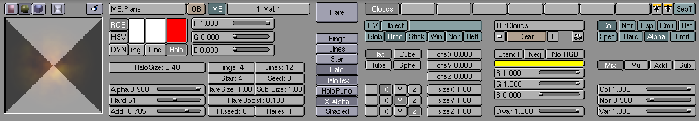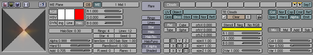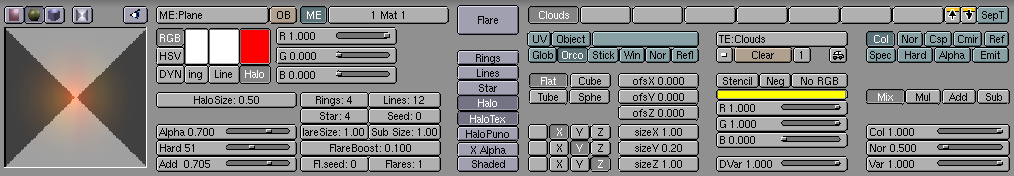 Go back to the MaterialButtons F5 and make the texture-color a yellow color with the RGB sliders on the right side of the material buttons. To stretch the yellow spots from the cloud texture decrease the "SizeY" value down to 0.30.