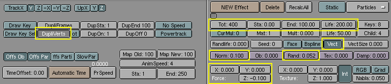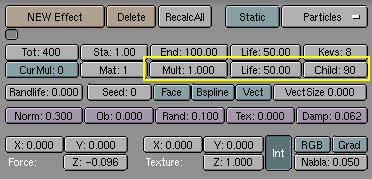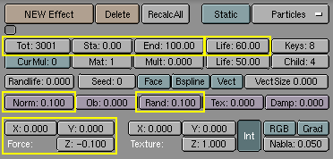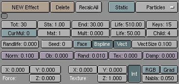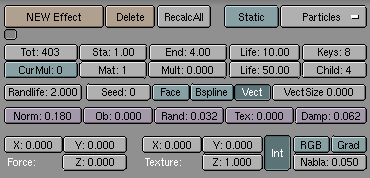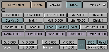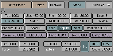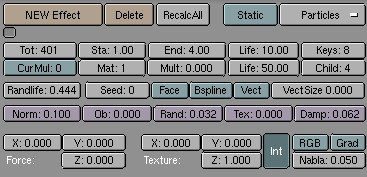 The total number of particles specified in the Tot: button are uniformly created along a time interval. Such a time interval is defined by the Sta: and End: NumButtons, which control the time interval (in frames) in which particles are generated.