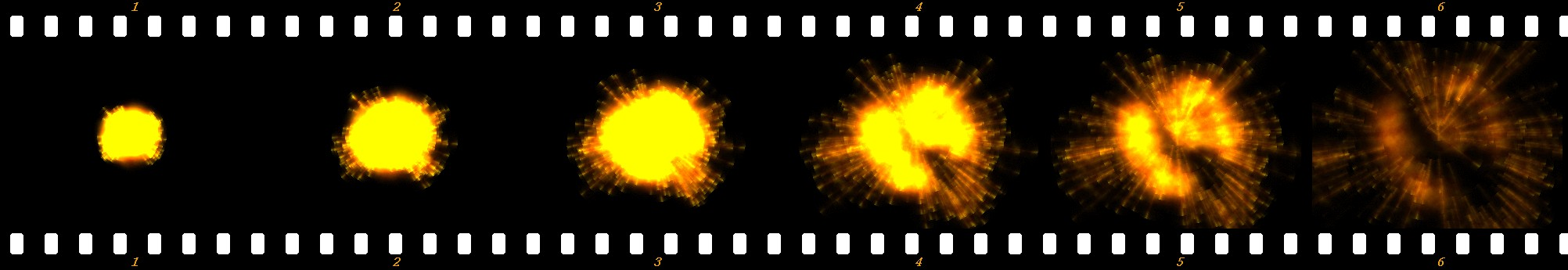 My explosion is composed from two particle systems, one for the cloud of hot gases and one for the sparks. I took a rotated version of the emitter for generating the sparks. Additionally, I animated the rotation of the emitters while the particles were being generated.