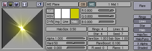 With the particle emitter selected, go to the MaterialButtons F5 and add a new material. Make the new material a halo-material by activating the Halo button. Also, activate HaloTex, located just below this button. This allows us to use a texture later.