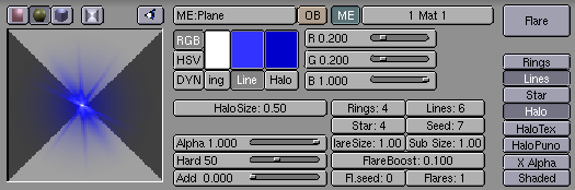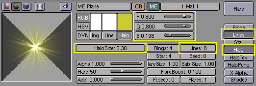 The MaterialButtons change to the HaloButtons. Choose Line, and adjust Lines: to a value of your choosing (you can see the effect directly in the Material-Preview). Decrease HaloSize: to 0.30, and choose a color for the Halo and for the lines (Figure 6).