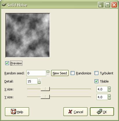 We’ll save it to the desktop for ease of access. Make sure to save it as .xcf. This is the GIMP's native file format, so it’ll preserve all your layers, channels and alpha. Our final image will be saved differently. Now go to Filters>Render>Clouds>Solid Noise. Feel free to play around with the functions, but for your final choice, enter the following: